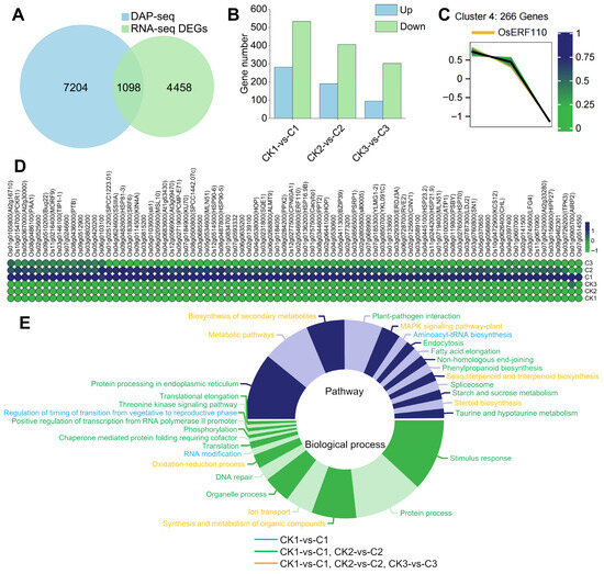 Analysis of OsERF110 regulatory network. (A) DAP-seq target genes intersected with RNA-seq DEGs. (B) The number and expression of intersection genes in different samples. (C) Trend analysis of OsERF110. The color represents the membership value. (D) The expression heat map of 62 target genes, and the color indicates the level of expression. (E) The functional analysis of 62 target genes; the upper half of the circle indicates the pathway, and the lower half of the circle indicates the biological process. The proportion of the circle graph indicates the number of genes in the pathway or biological process, and the color indicates the differential expression of genes in the sample.