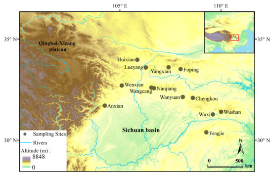 - Wang, B.; Jiang, J.P.; Xie, F.; Li, C. Postglacial colonization of the Qinling Mountains: Phylogeography of the swelled vent frog (Feirana quadranus). PloS ONE 2012, 7, e41579. [Google Scholar] [CrossRef] [PubMed]