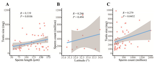 - Chen, C.; Huang, Y.Y.; Liao, W.B. A comparison of testes size and sperm length between Polypedates megacephalus populations at different altitudes. J. Herpetol. 2016, 26, 249–252. [Google Scholar]