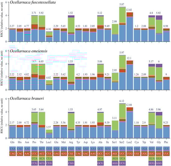 Relative synonymous codon usage (RSCU) of the three complete Ocellarnaca mitogenomes. Note, RSCU is a relative value calculated from codon usage counts, which labels it as ‘(relative value, no unit)’ to indicate that it is a relative metric.