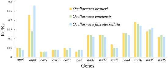 We performed Ka/Ks analysis of the 13 PCGs of the mitogenomes to investigate the evolutionary selection constraints of the three Ocellarnaca species (Figure 3). All PCGs exhibited Ka/Ks values less than 1, demonstrating purifying selection across the genomes [48]. Among them, atp8 of O. braueri and O. fuscotessellata exhibited the most elevated Ka/Ks ratios, indicating the relaxed purifying selection. By contrast, cox1 of all three species had the lowest Ka/Ks ratio, suggesting that harmful mutations were eliminated by purifying selection to preserve the integrity of the complex core subunits [49,50].