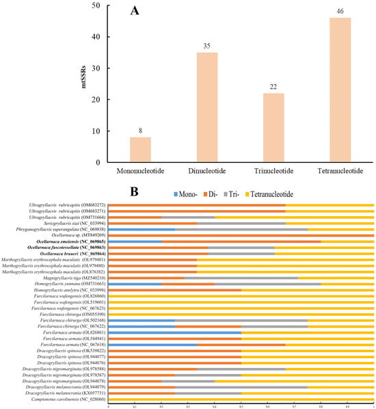 To conduct mtSSR analysis for the whole mitogenomes, we used the three circular mitogenomes that contained the control regions. The mitogenomes of O. braueri, O. fuscotessellata, and O. emeiensis contained 5–8 mtSSRs, a range that fell within the range of 1–8 mtSSRs observed across all 18 analyzed Gryllacrididae species. O. braueri and O. fuscotessellata had the highest number of mtSSRs and presented 8 mtSSRs each. By contrast, O. emeiensis had only five mtSSRs, of which one was located in trnD and another in the control region (Table 1). A total of 111 mtSSRs were found, representing less than 1% of the mitogenomes analyzed and consistent with nuclear genome microsatellite densities (0.02–3.1%) in insects. A total of 49 SSR mutations were detected in this study, suggesting their potential utility as SSR markers for further investigation (Table S6). Analysis revealed variations in the relative abundance of different SSRs across genera. The average number of mtSSRs in the genera Magnigryllacris Li, Yin & He, 2024 and Ocellarnaca was higher than in other genera with a similarly shaped median ocellus and a male abdominal apex split along the midline (Table 2).