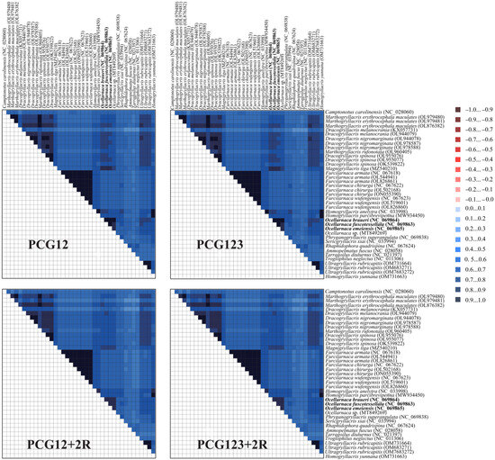 Evolutionary rate heterogeneity among the four Gryllacrididae datasets was assessed using AliGROOVE similarity analysis. The algorithm computes pairwise comparison scores ranging from −1 (red; indicating significant evolutionary rate divergence) to +1 (blue; representing perfect rate congruence).