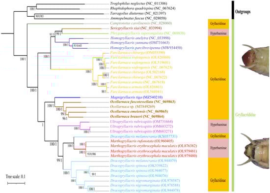 Recent advances in molecular biology and genomics have been crucial in addressing phylogenetic relationships. Mitochondrial genomes (mitogenomes) are effective tools for studying evolution in humans, animals, and plants [14,15,16,17,18,19]. Phylogenomic analyses have provided resolution of the phylogenetic relationships among Orthoptera: (Rhaphidophoridae (Schizodactylidae ((Gryllacrididae (Stenopelmatidae + Anostostomatidae)) + (Prophalangopsidae + Tettigoniidae)))) [20]. A recent study also supported the non-monophyletic relationships between the subfamilies Hyperbaeninae and Gryllacridinae based on 13 protein-coding genes (PCGs) [21], aligning with Brunner’s classification but contradicting that of Cadena-Castañeda [12]. Additionally, the monophyly of Homogryllacris Liu, 2007, Furcilarnaca Gorochov, 2004, Ultragryllacris Gorochov & Dawwrueng, 2015, and Capnogryllacris Karny, 1937 was recovered [22]. A phylogenetic analysis of Chinese Gryllacrididae species revealed that the genera Phryganogryllacris Karny, 1937, Capnogryllacris, and Eugryllacris Karny, 1937 failed to form monophyletic groups, resulting in six new genera being proposed [1]. The genus Ocellarnaca Gorochov, 2004 is defined by a brownish or yellowish-brown color, a median ocellus as large as or slightly wider than the antennal sockets, and the ninth abdominal tergite in males having a pair of lobiform processes, each bearing one spine. Ocellarnaca currently includes 17 valid species, but the complete mitogenome of only one species of unknown name has been defined (Ocellarnaca sp., MT849269) [23].