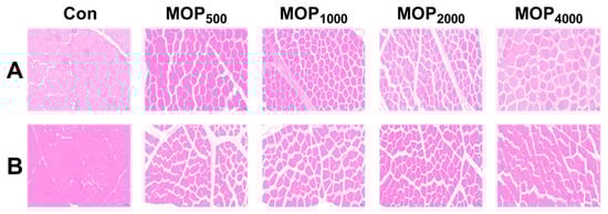 In breast muscle, the MOP1000, MOP2000, and MOP4000 groups displayed smaller cross-sectional areas and muscle fiber diameters but higher muscle fiber density compared to the control (p < 0.01), with MOP1000 showing the most pronounced effects (p < 0.01, Figure 1 and Table 6). Similarly, thigh muscle fibers in MOP groups had smaller cross-sectional areas and diameters, while muscle fiber density increased significantly in the MOP2000, and MOP4000 groups (p < 0.01, Figure 1 and Table 6).