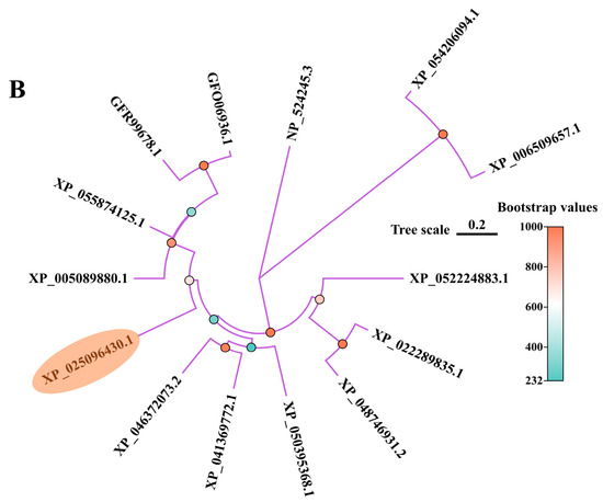 The amino acid (aa) sequence of PcNPFR (GenBank accession number, XP_025096430.1) were selected as the query to map the National Center for Biotechnology Information (NCBI) GenBank database via BlastP (https://blast.ncbi.nlm.nih.gov/Blast.cgi?PROGRAM=blastp&PAGE_TYPE=BlastSearch&LINK_LOC=blasthome accessed on 14 July 2025) and retrieve available NPFR orthologs from other species. The Gene Doc (http://nrbsc.org/gfx/genedoc/index.html accessed on 14 July 2025) plus Clustalx 2.0 (http://www.clustal.org/clustal2/ accessed on 14 July 2025) software were integrated for multiple sequence alignment. Analysis of the functionally conserved domains was performed using the Interpro database (http://www.ebi.ac.uk/interpro/ accessed on 14 July 2025) and NCBI Conserved Domains Search online tool (https://www.ncbi.nlm.nih.gov/Structure/cdd/wrpsb.cgi accessed on 14 July 2025). The phylogenetic tree of homologous sequences was constructed by neighbor-joining algorithm with 1000 bootstrap replicates in the MEGA 7.0 software package [36]. The tree was visualized using an online tool (https://www.chiplot.online/unrootedTree.html accessed on 14 July 2025).