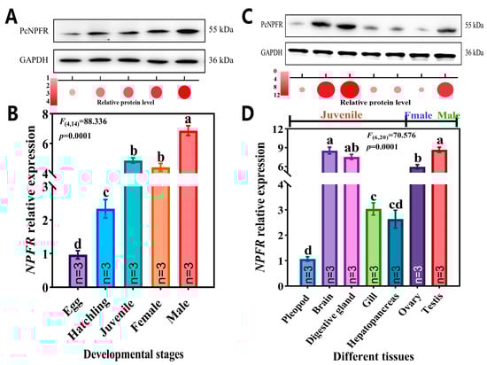 Stage- (A,B) and tissue-specific (C,D) expression patterns of PcNPFR. Protein and mRNA levels of embryonic stage and pleopod tissues were set as calibrators and relative expressions of PcNPFR were normalized to GAPDH. Different lowercase letters denoted significant differences—p < 0.05.