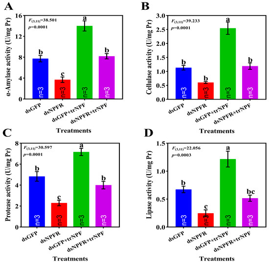 Effects of NPF–NPFR signaling on digestive system were evaluated using enzymatic activities as indicators (Figure 5). Post dsNPFR silencing, activities of α-amylase, protease and lipase were significantly compromised, down by 1.08-fold, 2.41% and 30.69%, respectively, relative to dsGFP group, accompanied by substantial yet not significant repression for cellulase activity. The depletion of enzymatic activities was restored to levels of dsGFP group following trNPF compensation. In terms of dsGFP group, trNPF injection significantly lifted activities of α-amylase, cellulase, protease and lipase, up by 81.11%, 1.24-fold, 48.28% and 80.71%, respectively.