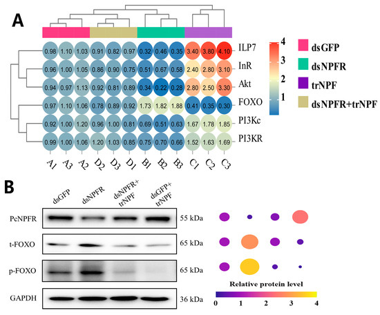 As shown by Figure 6A, ILP7/InR/Akt/PI3Kc/PI3KR were all significantly suppressed post NPFR silencing relative to the dsGFP, down by 63.67% (F = 201.962, df = 3.11, p = 0.0001), 41.52% (F = 85.977, df = 3.11, p = 0.0001), 72.37% (F = 83.103, df = 3.11, p = 0.0001), 41.35% (F = 60.544, df = 3.11, p = 0.0001) and 30.83% (F = 41.68, df = 3.11, p = 0.0001), respectively. Contrary to this trend, FOXO transcript level manifested a dramatic surge of 73.49% (F = 235.185, df = 3.11, p = 0.0001). Upon trNPF compensation, the case was opposite for groups dsGFP + trNPF vs. dsGFP and dsNPFR + trNPF vs. dsNPFR, where a considerable elevation of ILP7/InR/Akt/PI3Kc/PI3KR and a diminution of FOXO appeared. Resembling alterations of the FOXO mRNA level, the translation of t-FOXO and p-FOXO were substantially enhanced by the PcNPFR reduction, while depleted by the PcNPFR reinstation (Figure 6B and Figure S2). In addition, communication of NPF–NPFR signaling with the ISP pathway in a brain–gut modulatory pattern was proposed in Figure 7.