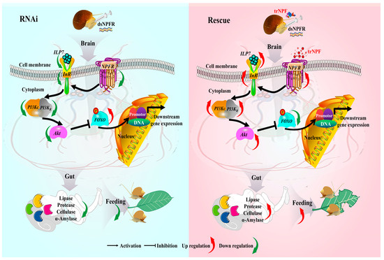 A schematic diagram of inter-organ modulation orchestrated by NPF–NPFR signaling and the ISP pathway in feeding and digestion. The insulin receptor (InR) binds with insulin-like peptides (ILP7) and initiates PI3K/Akt cascade to phosphorylate and represses the transcription factor FOXO and its downstream targets. Upon PcNPFR silencing (left panel), PcNPFR expressions were depleted (Figure 3B and Figure 6B) with ILP7/InR/PI3K/Akt transcript levels (Figure 6A), digestive enzymes (Figure 5) and feeding activity (Figure 4) all suppressed, except for the upregulation of p-FOXO and t-FOXO at protein and mRNA level (Figure 6). These were partially or fully reversed post trNPFR rescue (right panel), with opposite molecular, biochemical alterations and behavioral phenotypes.