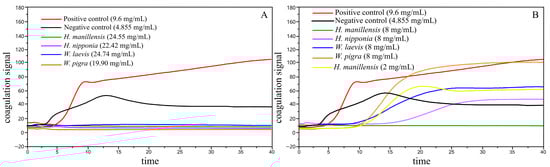 We evaluated recombinant LDTI proteins from four leech species as the study targets, conducting three independent experimental replicates per group. Key parameters monitored included (1) Activated Clotting Time (ACT), with a reference range of 100–240 s, and values >240 s indicating clinically significant prolongation; (2) Clot Rate (CR), with a normal interval of 10–35, where values <10 indicate pathological hypocoagulability; and (3) Platelet Function (PF), with a physiological threshold >1, and values ≤1 correlating with substantially elevated hemorrhagic risk. Through quantitative analysis of coagulation signature profiles, we assessed the anticoagulant activity of the target proteins. Typically, when an anticoagulant-active target protein is present, the addition of calcium ions results in either retarded clot formation kinetics or complete suppression of the coagulation cascade, leading to discernible divergence in hemostatic properties compared to control cohorts.