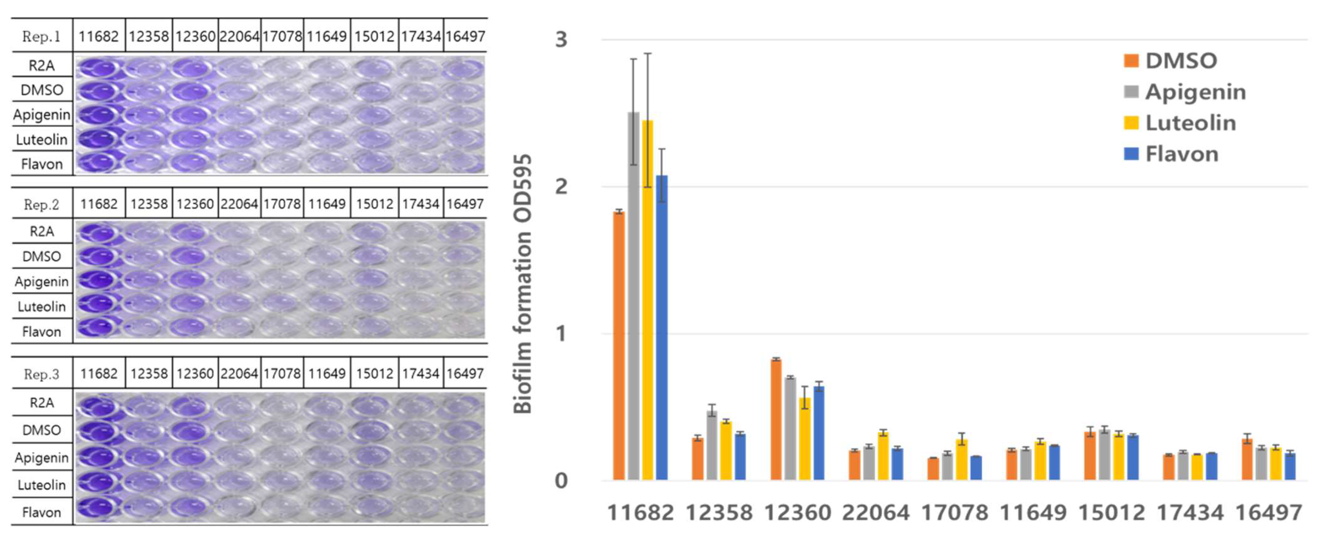 A. indigens KACC 11682 exhibited the highest biofilm formation ability in all treatments, including the control (DMSO), apigenin, luteolin, and flavone (