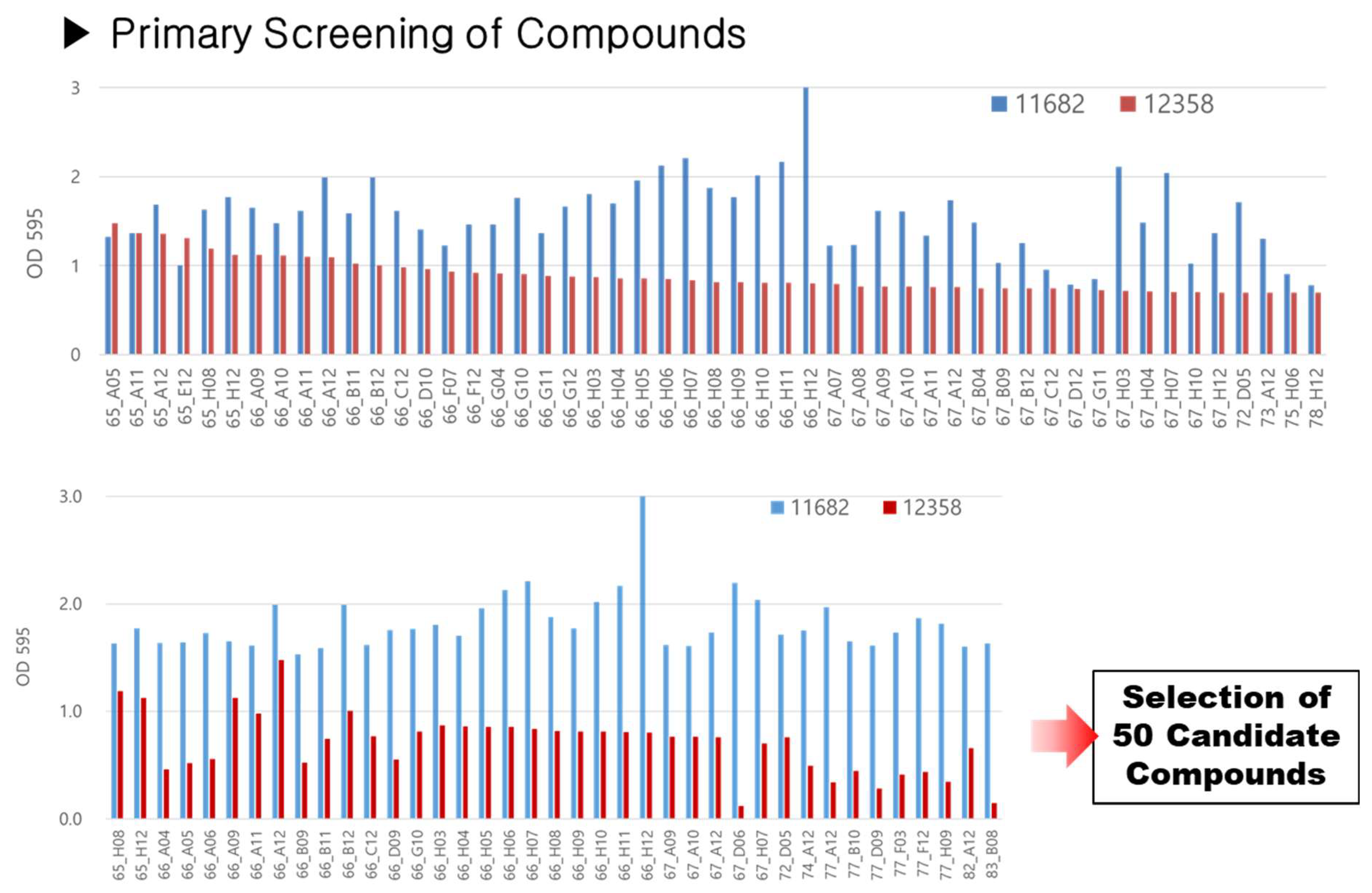 Among the 50 compounds selected from the primary screening, compounds were finally selected based on their ability to significantly induce biofilm formation in A. indigens KACC 11682. To accurately identify top-performing compounds, all raw optical density values were normalized against the mean of the DMSO controls for A. indigens on the same plate. The relevance of these compounds to known rice metabolic pathways was also considered. These compounds are expected to enhance nitrogen use efficiency (NUE) in rice and will be utilized in future studies to strengthen the symbiotic interaction between rice and nitrogen-fixing microorganisms.
