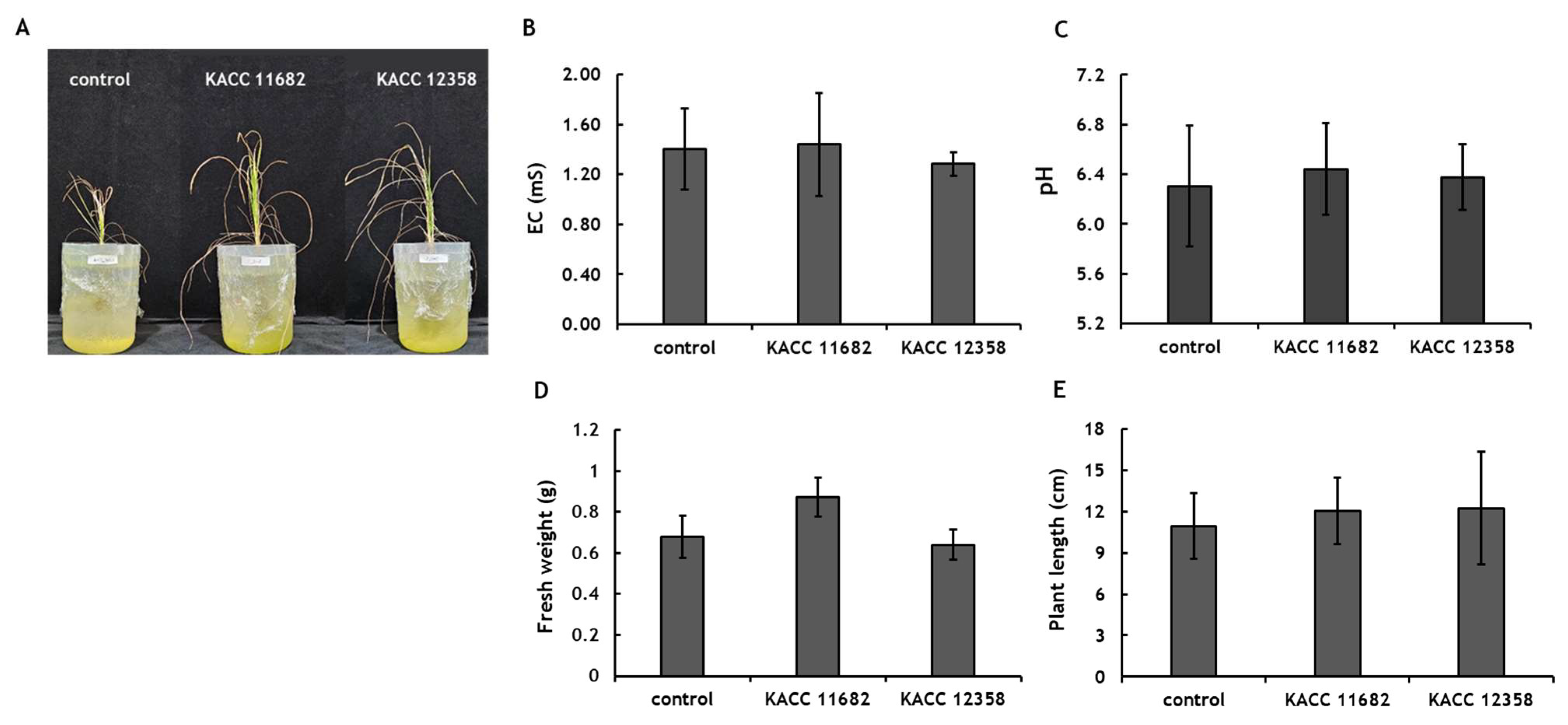 21] with controlled nitrogen sources. The experiment was conducted on the Samgwang rice variety, and after 70 days of inoculation, plant height, biomass, and the EC and pH of the Yoshida solution were measured. The experiment was repeated 10 times, and the results were averaged.
