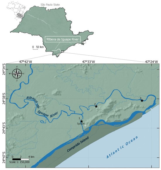 The Ribeira de Iguape River basin (24°42′29″ S; 47°33′19″ W) is one of the largest along the Brazilian coast, covering about 25,000 km2 of drainage area, of which 17,068 km2 lie within the state of São Paulo, covering 28 municipalities. Its headwaters are in the state of Paraná, and the river flows for about 470 km before reaching the Atlantic Ocean in the city of Iguape, on the southern coast of São Paulo State (SP) [40,41]. Near the coastal region, the river delivers a high freshwater load to the estuarine environment, forming the Cananéia–Iguape system, a network of lagoon channels situated within the United Nations Educational, Scientific and Cultural Organization (UNESCO) Biosphere Reserve [42].
