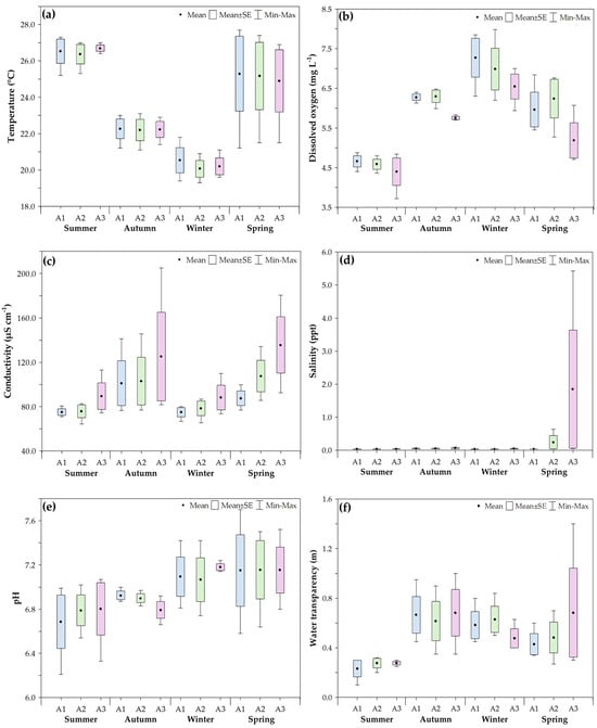 Boxplots showing the seasonal variation in environmental parameters ((a). water temperature; (b). dissolved oxygen; (c). electrical conductivity; (d). salinity; (e). pH; (f). water transparency) recorded in the three sampling areas from February 2014 to January 2015 in the Ribeira de Iguape River, Iguape (SP). A1 = Area 1, A2 = Area 2, A3 = Area 3.