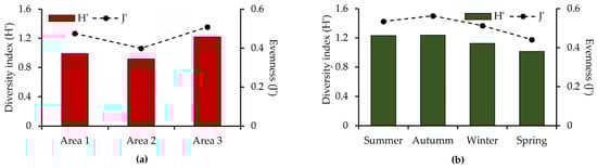 Spatial and temporal variation in the diversity index (H′) and evenness (J′) from February 2014 to January 2015 in the Ribeira de Iguape River, Iguape (SP). (a) Variation by area; (b) variation by season.