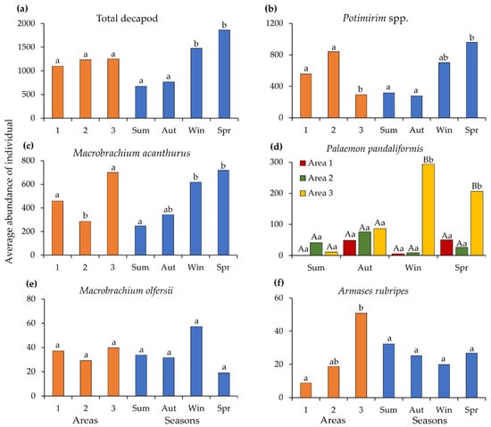 The results of the permutational multivariate analysis of variance (PERMANOVA) for the total number of decapods and the most abundant species, examining the effects of sampling area and season and their interaction: (a) total decapod; (b) Potimirim spp.; (c) Macrobrachium acanthurus; (d) Palaemon pandaliformis; (e) Macrobrachium olfersii; (f) Armases rubripes. (Sum—summer, Aut—autumn, Win—Winter, Spr—spring). Since no significant interaction between area and season was found, identical lowercase letters between columns of the same color (area or season) indicate no statistically significant differences (p > 0.05). For Palaemon pandaliformis, where a significant interaction between area and season was observed, capital letters indicate significant differences among areas within each season, whereas lowercase letters indicate significant differences among seasons within each area (p < 0.05).