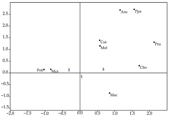 Correspondence analysis (CA) was employed to link total species abundance to the sampling areas across the entire study period. In this analysis, absolute abundance values were used, considering each species as an independent data group, which minimized the impact of the sampling design [55]. This analysis was conducted using the freely available software PAST (version 3.25).