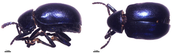- Kimoto, S.; Gressitt, J.L. Chrysomelidae (Coleoptera) of Thailand, Cambodia, Laos, and Vietnam. III. Eumolpinae. Esakia 1982, 18, 1–141. [Google Scholar] [CrossRef]