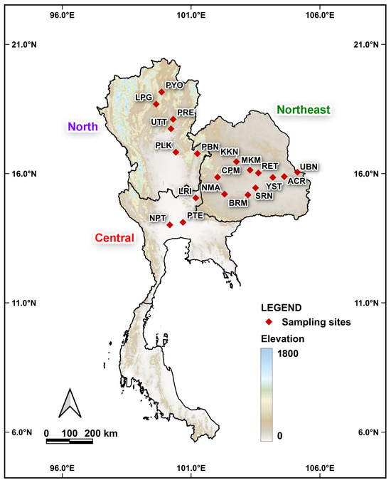 Map showing the sampling localities of Platycorynus peregrinus populations across Thailand. Each locality corresponds to the localities listed in Table 1.