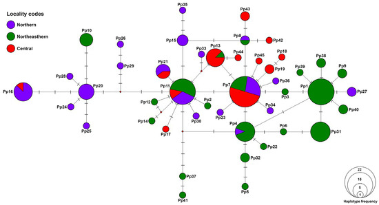 A mitochondrial DNA haplotype network revealed a complex genetic network among the populations from different geographic regions (Figure 3). A total of 45 haplotypes were identified, with several haplotypes shared across multiple populations and others restricted to specific localities. Three predominant haplotypes (Pp1, Pp7, and Pp11) were the most frequent but only Pp7 and Pp11 are widely distributed while Pp1 was restricted to the northeast of Thailand. Among 45 identified haplotypes, only 7 were shared among geographic regions. The network exhibited a star-like topology, suggesting historical population expansion. Overall, the haplotype network highlights a high level of genetic diversity across populations, with evidence of both historical gene flow and localized differentiation. The distribution of haplotypes suggests a mix of shared ancestral lineages and recent genetic divergence among certain populations.