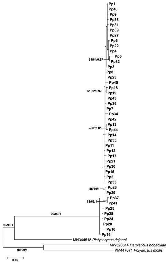 Bayesian phylogenetic tree of 45 COI haplotypes (Pp1–Pp45) of Platycorynus peregrinus from Thailand. Support values at nodes represent Maximum Likelihood bootstrap, Neighbor-Joining bootstrap, and Bayesian posterior probability, respectively. The en dash (–) indicates supporting values less than 50. Outgroups include Platycorynus dejeani, Herpisticus bobadillae, and Polydrusus mollis.