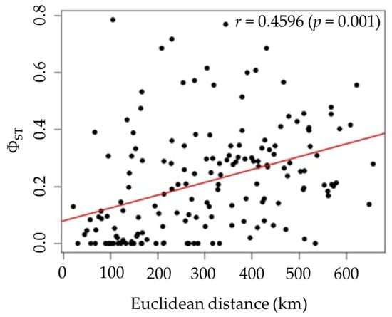 Isolation-by-distance (IBD) by Mantel test based on COI sequences, showing the relationship between genetic differentiation (ΦST) and geographic Euclidean distance (km). r represents the correlation coefficient, and p represents the probability value (p-value) assessing statistical significance.