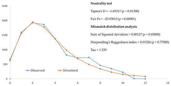 Neutrality tests of all populations yielded significant negative values for both Tajima’s D (–1.65317, p = 0.01300) and Fu’s Fs (–25.93013, p < 0.00001), suggesting possible population expansion or purifying selection. The mismatch distribution analysis revealed a unimodal and smooth pattern of pairwise differences among sequences, indicating an excess of low-frequency polymorphisms and recent population expansion (Figure 6). The observed distribution did not differ significantly from the expected under sudden expansion model, suggesting that the population has experienced recent demographic expansion. Both sum of square deviation and Harpending’s Raggedness index tests were not statistically significant (Figure 6).
