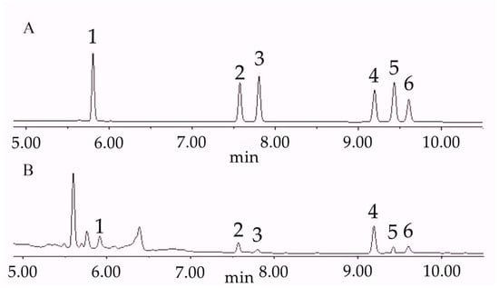 Chromatogram of steroid saponins. (A): chromatogram of standard reference; (B): chromatogram of sample (S6). 1: pseudoprotodioscin; 2: polyphyllin VII; 3: polyphyllin H; 4: polyphyllin II; 5: dioscin; 6: polyphyllin I.