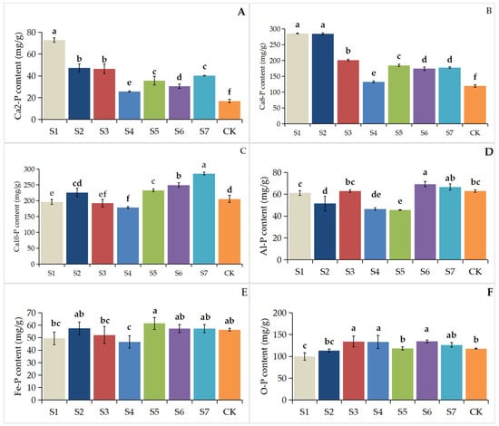 Contents of different inorganic phosphorus forms in the rhizosphere soil of Paris polyphylla var. Yunnanensis. (A): Ca2-P content; (B): Ca8-P content; (C): Ca10-P content; (D): Al-P content; (E): Fe-P content; (F): O-P content. S1: B. cereus Y1-1; S2: B. aryabhattai Z6-1; S3: B. aryabhattai Z3-4; S4: B. cereus Y1-1 + B. aryabhattai Z6-1; S5: B. cereus Y1-1 + B. aryabhattai Z3-4; S6: B. aryabhattai Z6-1 + B. aryabhattai Z3-4; S7: B. cereus Y1-1 + B. aryabhattai Z6-1 + B. aryabhattai Z3-4; CK: saline solution. Different letters indicate significant differences at p < 0.05 levels.