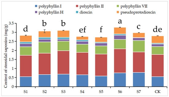 Contents of six steroidal saponins in Paris polyphylla var. yunnanensis plants under different treatments. Different letters indicate significant differences at p < 0.05 levels.