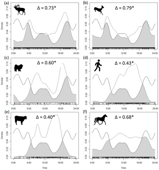 The diel activity patterns of wolves (solid line) and other species (dashed line) in Bogd Khan Mountain, Mongolia. (a) Diel activity pattern of red deer and wolves; (b) diel activity pattern of roe deer and wolves; (c) diel activity pattern of dogs and wolves; (d) diel activity pattern of humans and wolves; (e) diel activity pattern of cows and wolves; (f) diel activity patterns of horses and wolves. The coefficient of overlap (∆) measures the minimum area under the Kernel curve of the probability of activity density estimates, which is represented by the gray area in each graph. The presence of asterisks indicates the significance of the Mardia–Watson–Wheeler test of homogeneity for the hours of activity for pairs of species.