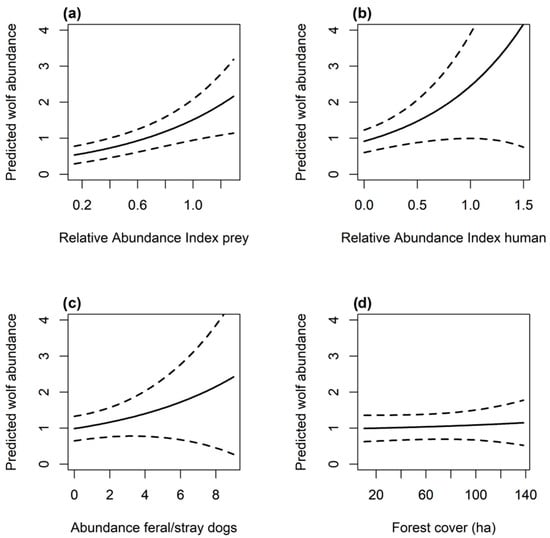 Predictions from the best model λ(year + dog + RAI_Prey + RAI_Human + Forest), p(year) describing the abundance (solid line, 95% CI as dashed line) of the gray wolf in Bogd Khan Mountain, Mongolia. (a) Predicted abundance of wolves to relative abundance index of humans; (b) predicted abundance to relative abundance of prey; (c) predicted abundance of wolves to abundance of dogs; (d) predicted abundance of wolves to area of forest. For the definition of model covariates, see Table 1.