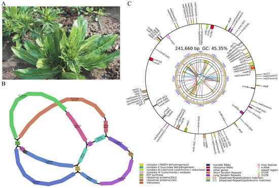 Mitochondria are semi-independent organelles, and their genomes are found in almost all eukaryotic cells [1]. Studies suggest that plant mitochondrial genomes typically possess greater length and structural complexity than those of animals [2]. Even within a single plant genus, mitochondrial genomes can exhibit considerable species-specific variations, including differences in genome length, arrangement of genes, and number of genes [3]. In certain plants, mitochondrial genomes exhibit linear conformations, while in others they can display branched or multichromosomal architectures [4]. This results from the fact that mitochondrial genome structures are subject to various alterations, such as frequent recombination of repetitive sequences, gene loss, and the transfer of genes from mitochondria to chloroplast or nuclear genomes. These genomic rearrangements and repetitive sequences are integral to the evolutionary dynamics of plant mitochondrial genomes [5,6]. Furthermore, rearrangements of the mitochondrial genome may lead to the generation and accumulation of novel chimeric open reading frame (ORF) genes, which in turn disrupt the normal function of mitochondrial genes, ultimately inducing male sterility and potentially resulting in cytoplasmic male sterility (CMS) [7,8]. CMS-based hybridization techniques have been widely employed in the cultivation of progeny, significantly enhancing crop yield, stress resistance, and adaptability [9]. These methods are considered promising approaches for maintaining agricultural productivity [10]. Therefore, mitochondrial genomes provide crucial genetic information for research on plant evolution, cytoplasmic inheritance, and the utilization of crop heterosis.