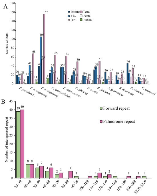 Mitochondrial genomic repeat sequences of E. foetidum. (A) Comparative analysis of the quantities of simple sequence repeats and the sizes of mitochondrial genomes across 12 Apiales species, with insights from vertebrate mitochondrial genomes revealing repeats and gene duplications. (B) Distribution of repeat sequence lengths within the mitochondrial genome of E. foetidum.