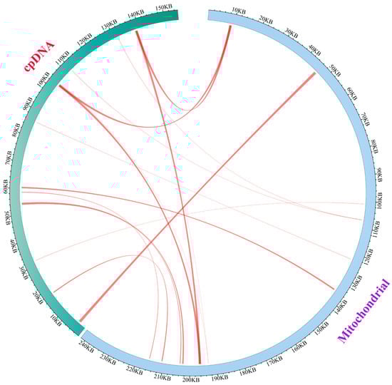 In the evolutionary journey of higher plants, the transfer of genetic material among cells is a common phenomenon observed in mitochondrial genomes [59]. Analysis of sequence similarity uncovered 16 homologous segments spanning from 38 to 992 bp between the chloroplast and mitochondrial genomes (Figure 3). The number of mismatches within these segments varied from 1 to 179. In total, these homologous fragments span 6842 base pairs, representing approximately 2.83% of the mitochondrial DNA in E. foetidum. This percentage is significant as it reflects a substantial portion of the mitochondrial genome, which in humans is typically 16,569 base pairs long and contains 37 genes [60]. These fragments are designated as MTPTs, indicating sequences transferred from the chloroplast to the mitochondrion. Among them, MTPT 1 is the largest homologous segment, measuring 992 base pairs.