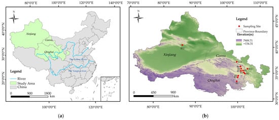 Sampling points of 12 Chinese seabuckthorn distribution areas in China. Note: (a) Map of China; (b) map of the study area (Gansu, Qinghai, and Xinjiang provinces). This figure was created using the standard map (approval number: GS (Beijing, China) No. 0650 (2024)) downloaded from the Standard Map Service Website of the China Bureau of Surveying and Mapping Geographic Information. The distance between sampling sites ranges from 34.28 to 15,817.74 km.