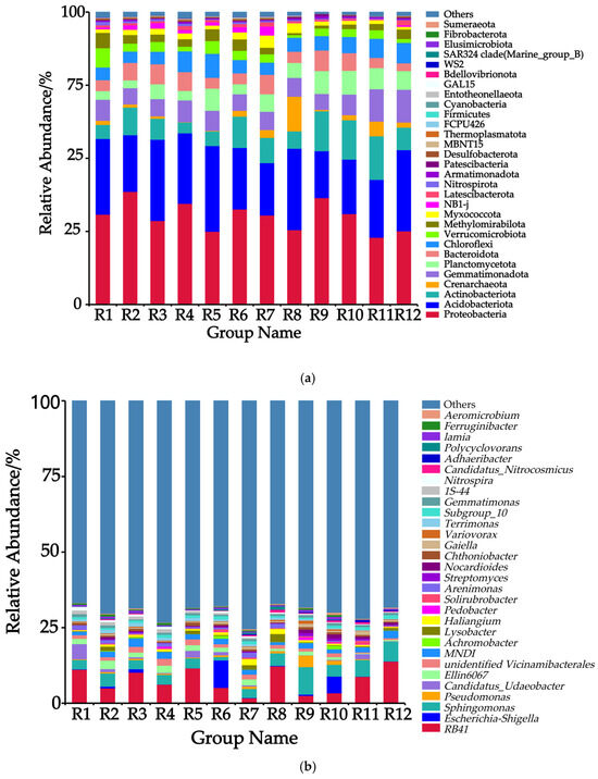 Among the rhizosphere soil samples of Chinese seabuckthorn from the 12 habitat types, the relative abundances of the top 30 bacterial phyla are presented in Figure 2a. At the phylum level, Proteobacteria phylum (22.93–38.61%), Acidobacteriota phylum (16.03–29.31%), Actinobacteriota phylum (3.69–14.89%), Crenarchaeota phylum (0.11–11.85%), and Gemmatimonadota phylum (5.43–11.21%) exhibited the highest relative abundances. Significant differences were observed in the ranking of bacterial phyla across the 12 habitats: Proteobacteria phylum constituted the dominant community in habitats R1, R2, R3, R4, R6, R7, R9, R10, and R11, while Acidobacteriota phylum predominated in habitats R5, R8, and R12. Compared to the R11 habitat, the other 11 habitats demonstrated elevated abundance of Proteobacteria phylum and reduced abundance of Actinobacteriota phylum in the soil bacterial communities.