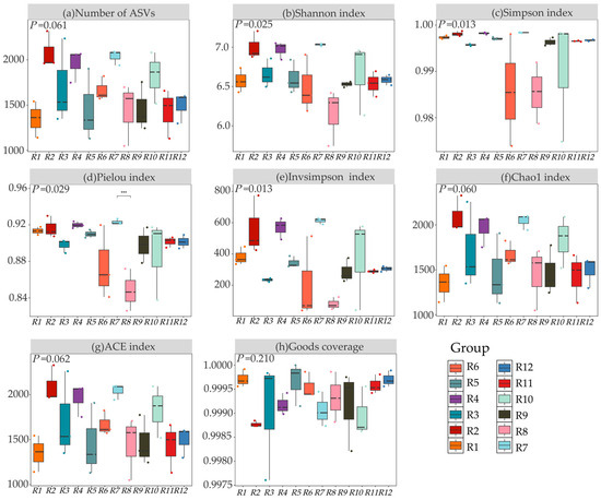 α-diversity of bacterial communities in 12 habitats. Note: (a) Number of ASVs, (b) Shannon index, (c) Simpson index, (d) Pielou index, (e) Invsimpson index, (f) Chao1 index, (g) ACE index, and (h) Goods coverage. *** represents p < 0.001.