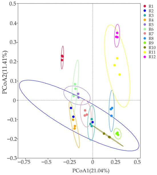 The PCoA analysis based on Bray–Curtis distance (as shown in Figure 4) revealed that among the 12 habitats, the bacterial communities in habitats R2 and R11 exhibited significant within-group dispersion (with large compositional differences and low aggregation among samples). In contrast, the remaining 10 habitats demonstrated strong within-group homogeneity, particularly habitats R1, R9, and R12, which showed the highest similarity (with the smallest within-group coefficient of variation and high aggregation). The explanatory rates of PC1 and PC2 were 21.04% and 11.41%, respectively, accounting for a cumulative 32.45% and effectively reflecting differences in the community structure among habitats.
