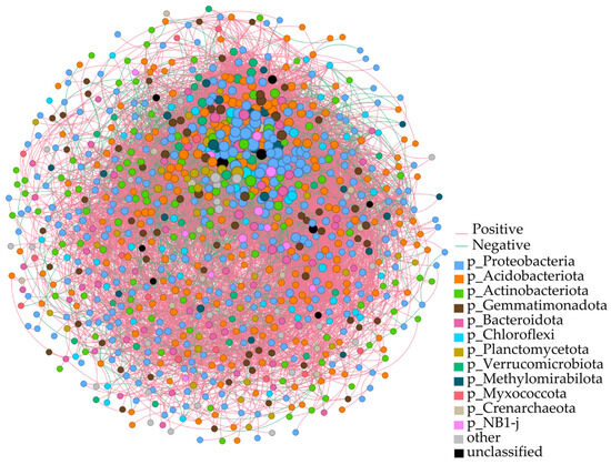 To investigate the co-occurrence patterns and inter-community interactions of bacterial phyla in the rhizosphere soils of Chinese seabuckthorn across 12 habitat types, a phylum-level co-occurrence molecular network was constructed (Figure 5). The results showed that the number of nodes at the level of rhizosphere soil bacterial phylum of Chinese seabuckthorn was 949, the number of edges was 15,703, the average degree was 33.09, the average path length was 1.92, the diameter of the network was 5.61, the density of the network was 0.03, the clustering coefficient was 0.44, and 70.85% of the correlated edges were positively correlated. Among the bacterial phyla, Proteobacteria (32.66%), Acidobacteriota (21.81%), Actinobacteriota (10.96%), Gemmatimonadota (7.23%), Bacteroidota (5.96%), and Chloroflexi (5.00%) exhibited high connectivity, centrality, and abundance. These phyla occupied central positions within the network, demonstrating significant influence through extensive interactions with other bacterial phyla.