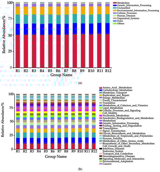 Based on the PICRUSt Level 1 functional classification (Figure 6a), a total of eight functional types were identified, with the top five being Metabolism, Genetic Information Processing, Unclassified, Environmental Information Processing, and Cellular Processes in descending order. Among these, Metabolism functions dominated across all habitats, with the highest abundance observed in the R11 habitat (52.02%) and the lowest in the R4 habitat (50.40%). Compared to the R8 habitat, the other 11 habitats exhibited a decrease in the abundance of Genetic Information Processing and an increase in the abundance of Environmental Information Processing.
