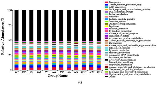 Based on the PICRUSt Level 3 functional classification (Figure 6c), a total of 31 functional modules were identified, among which five core modules (with relative abundance > 15%) included Transporters, Genera_function_prediction_only, ABC_transporters, DNA_repair_and_recombination_proteins, and Two_component_system. Notably, Transporters dominated across all habitats, with the highest abundance observed in the R6 habitat (4.92%) and the lowest in the R12 habitat (4.37%). Compared to the R8 habitat, the other 11 habitats exhibited a decrease in the abundance of General_function_prediction_only, while showing an increase in the abundances of DNA_repair_and_recombination_proteins and Two_component_system.