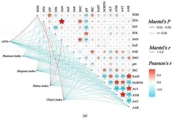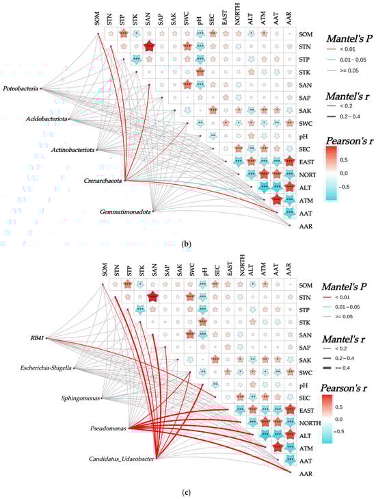 Mantel analysis between rhizosphere soil bacterial community and habitat factors of Chinese seabuckthorn. Note: * denotes p < 0.05, ** denotes p < 0.01, and *** denotes p < 0.001. (a) α-diversity, (b) bacterial phylum level, and (c) bacterial genus level.