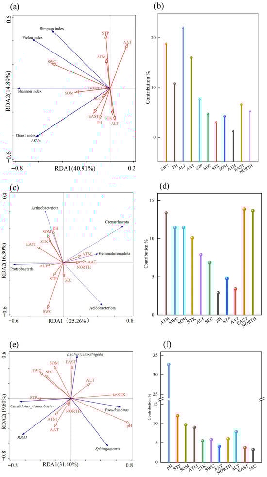 RDA between the rhizosphere soil bacterial community structure and habitat factors of Chinese seabuckthorn. Note: Red arrows indicate plant community characteristics and soil factors, and blue arrows indicate fungal diversity indices. (a,b) α-diversity; (c,d) bacterial phylum level; (e,f) bacterial genus level.