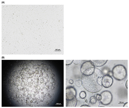 The tissue fragments were digested in 2 mg/mL collagenase type I (Gibco, Thermo Fisher Scientific, Waltham, MA, USA) at 37 °C for 30 min with shaking at 150 rpm. The resulting suspension was filtered through a 100 μm cell strainer (SPL Life Sciences, Pocheon, Republic of Korea) and centrifuged at 1000 rpm for 5 min at 4 °C. The supernatant containing adipocytes was carefully removed using a wide-bore pipette (Corning Inc., Corning, NY, USA), and the remaining stromal vascular fraction (SVF) pellet was resuspended in DMEM/F12 medium supplemented with 10% fetal bovine serum (Gibco, Thermo Fisher Scientific, Waltham, MA, USA) and 1% Antibiotic-Antimycotic Solution. The SVF cells were resuspended in Matrigel (Corning Inc., Corning, NY, USA), and approximately (5 × 103 cells/well) were seeded in 12-well tissue culture plates (Corning Inc., Corning, NY, USA) in dome-shaped droplets. The culture medium was composed of Advanced DMEM/F-12 without FBS, supplemented with 50 ng/mL of recombinant murine epidermal growth factor (mEGF), 100 ng/mL of recombinant human Noggin (hNoggin), and 100 ng/mL of recombinant human fibroblast growth factor-7 (FGF-7) (all from PeproTech, Cranbury, NJ, USA), along with 3 µM of CHIR99021, 10 mM of nicotinamide, 1 mM of N-acetyl-L-cysteine (NAC), and 10 µM of Y-27632 dihydrochloride (all from Sigma-Aldrich, Merck KGaA, Darmstadt, Germany). Cultures were incubated at 37 °C with 5% CO2, and the medium was changed every 5 days. Organoids (ASC-to-epithelial-like cells) between passages 9 and 11 were used for experiments.
