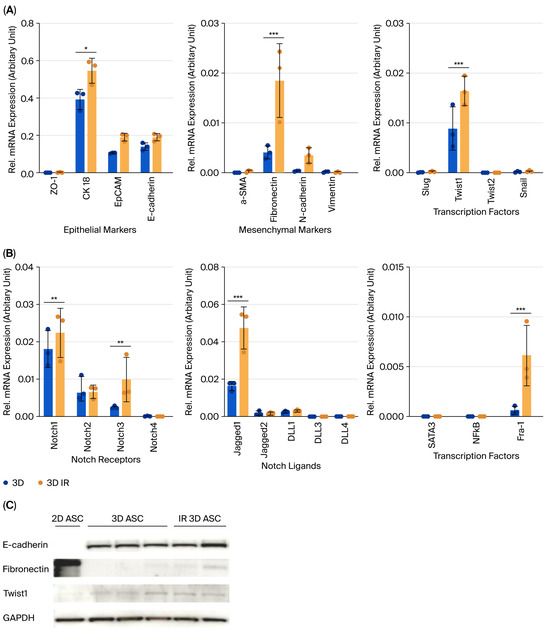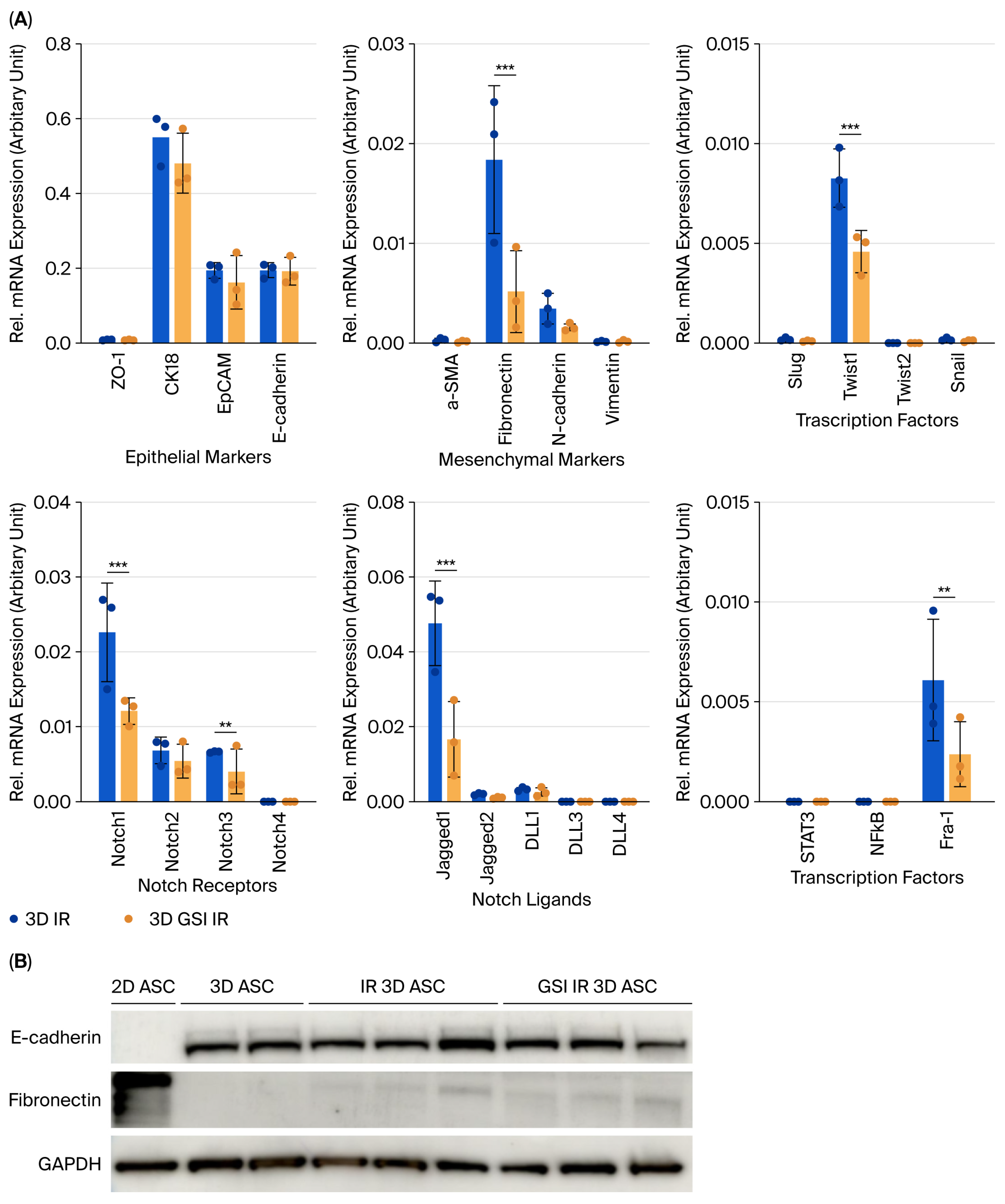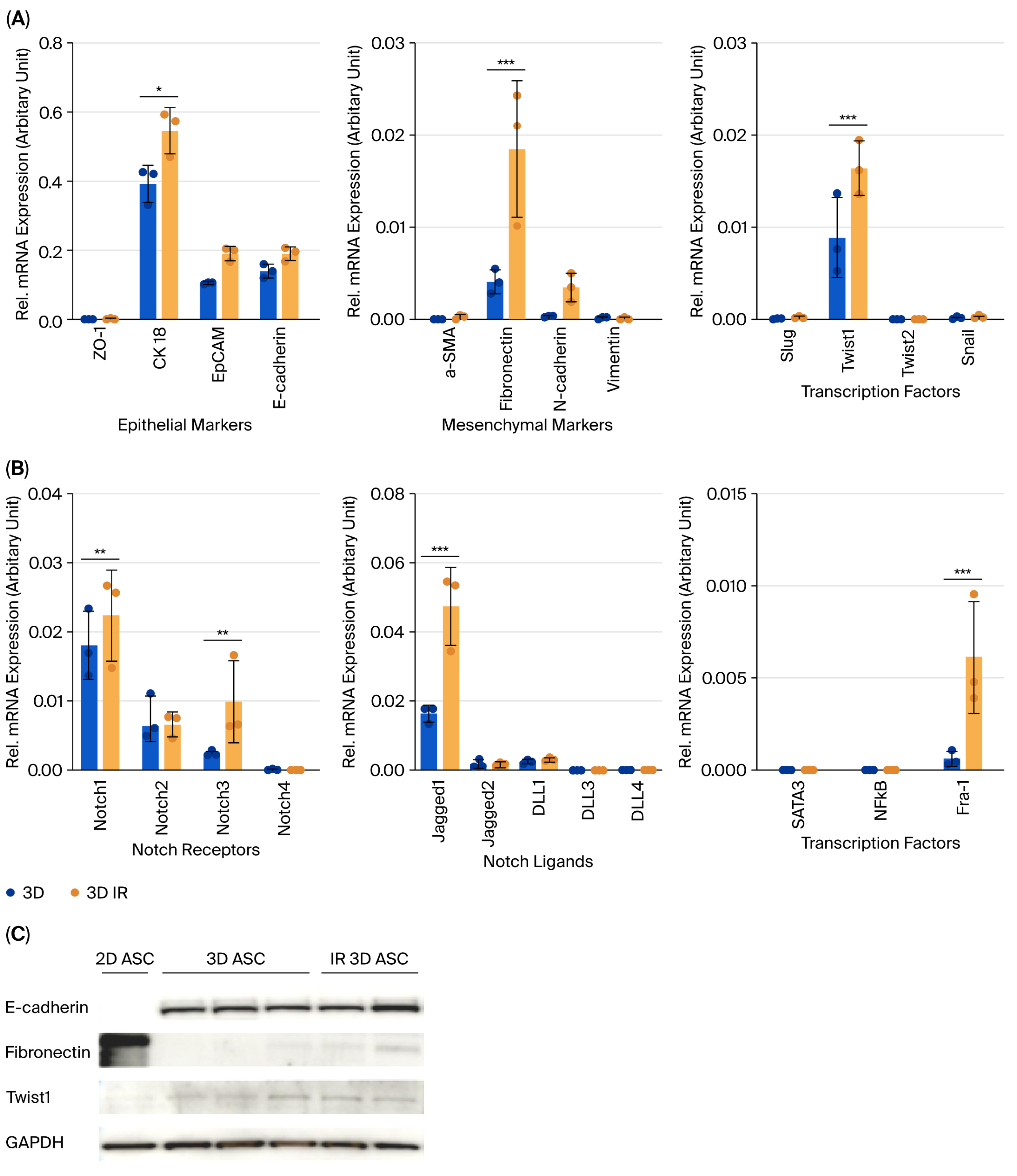 Radiation exposure induced EMT in 3D ASC organoids, as indicated by the upregulation of fibronectin and Twist1. Concurrently, Notch1, Notch3, Jagged1, and the downstream effector Fra-1, were significantly increased, implicating Notch pathway activation in EMT progression. Specifically, Notch1 has been implicated in self-renewal, while Notch3 contributes to differentiation [