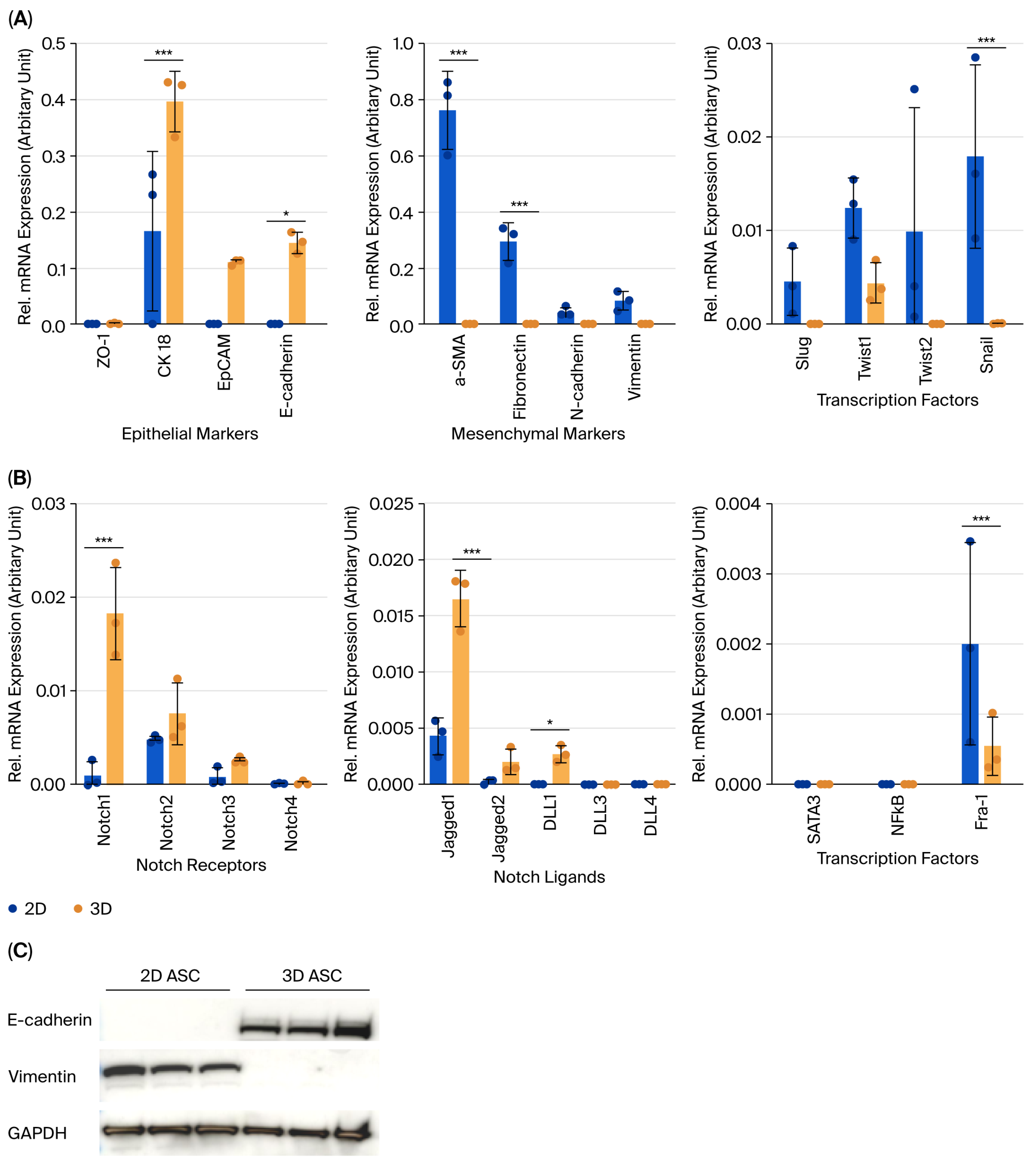 Comparative analyses revealed that 3D-cultured ASCs retained epithelial characteristics, including higher E-cadherin and CK18 expression, while 2D ASCs exhibited increased mesenchymal traits (e.g., α-SMA, and fibronectin) and upregulated EMT transcription factors (Slug, Twist1, and Snail), with Snail showing the most significant increase. These findings align with previous studies reporting that 3D cultures preserve mesenchymal stem cell characteristics and enhance cell–ECM interactions [