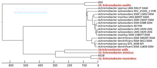 Five strains belonging to the genus Achromobacter (B31b, B32, B34, B35, and B36t) were identified by 16S rRNA gene sequencing, as MALDI-TOF analysis did not yield conclusive results. The sequences showed high similarity (>99%) to multiple species within this genus, including A. animicus, A. mucicolens, A. ruhlandii, A. deleyi, A. kerstersii, A. spanius, A. veterisilvae, A. agilis, A. insuavis, A. marplatensis, A. piechaudii, A. anxifer, A. pestifer, A. dolens, and A. aegrifaciens. The close genetic proximity among these taxa prevented a definitive species-level identification.